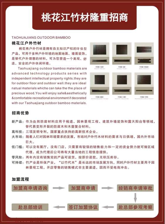 湖南桃花江竹材科技股份有限公司是湖南生產環保竹材的廠家,地處提名"楠竹之鄉"——湖南益陽市桃江縣,竹子資源得天獨厚。公司成立于2001年7月,注冊資金5076萬,為湖南省農業產業化龍頭企業和湖南省林業工業龍頭企業,“桃花江”牌系列竹材為湖南竹材產品。公司為中國林重點龍頭企業和國家高新技術企業。公司通過了ISO9001:2008國際質量體系認證和ISO14001:2004環境管理體系認證。