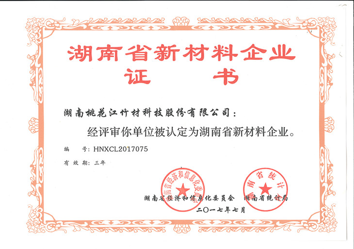 2017年7月,湖南省經濟和信息化委員會、湖南省統計局為湖南桃花江竹材科技股份有限公司正式頒發“湖南省新材料企業”證書(證書編號:HNXCL2017075)。湖南省新材料企業的認定,標志著湖南桃花江竹材科技在新型竹材領域的成績得到國家認可與支持,是一項極具含金量的突破性榮譽。作為中國竹業龍頭企業,湖南桃花江竹材科技一直走在新型竹材研發、運用和推廣的前沿,為全球竹產業的發展持續貢獻力量。